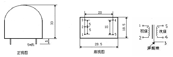 八、使用说明: HKPT26C系列电压变换器:引针 1 、 2为初级,引针 4 、 5 为次级,引针 1 、 5 为同名端。引针 3 为屏蔽。 |