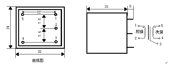 八、使用说明: HKPT2635 系列电压变换器:引针 1 、 2 为初级,引针 4 、 5 为次级,引针 1 与引针 5 为同名端,引针 3 为屏蔽。 |