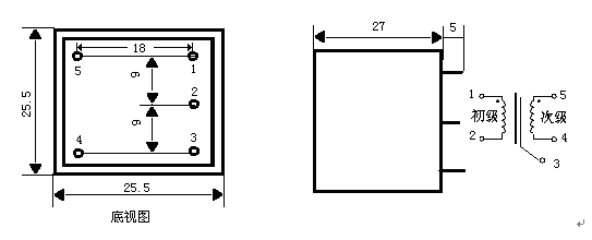八、使用说明: HKPT2635C 系列电压变换器:引针 1 、 2 为初级,引针 4 、 5 为次级,引针 1 与引针 5 为同名端,引针 3 为屏蔽。 |