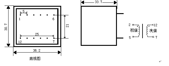 一、特点: 1、小巧轻便,印刷线路板直接焊接安装; 2、全封闭,机械和耐环境性能好,电压隔离能力强,安全可靠。 二、使用环境条件: 1、环境温度:-55℃~+85℃; 2、相对湿度:温度为40℃时不大于90%。 三、工作频率范围:20Hz~20KHz。 四、绝缘耐热等级:B级(130℃)。 五、安全特性: 1、绝缘电阻:常态时大于1000MΩ; 2、抗电强度:可承受工频6000V/1分钟; 3、阻 燃 性:符合UL94-Vo级。 六、外形图、安装尺寸和线圈图: