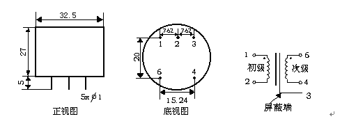 八、使用说明: HKPT2652C 系列电压变换器:引针 1 、 2 为初级,引针 4 、 6 为次级,引针 1 与引针 6 为同名端,引针 3 为屏蔽。