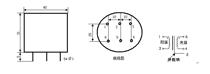 八、使用说明: HKPT2654 系列电压变换器:引针 1 、 2 为初级,引针 4 、 6 为次级,引针 1 与引针 6 为同名端,引针 3 为屏蔽。 |