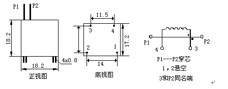 六、外形图、安装尺寸和线圈图:(输出绕组引脚间距宽)见下图。