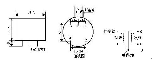 八、使用说明: HKCT2152 保护用电流变换器:卧式引针,初级侧引线方式。初级套红色套管的侧引线与引针 6 为同名端。引针 4 、 6 为次级,引针 3 为屏蔽。初级引线长度可根据用户要求设计。 |